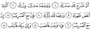 আমি কি তোমার অন্তর প্রশস্ত-প্রশান্ত করে দেইনি? তোমার উপর থেকে ভীষণ বোঝা নামিয়ে দিয়েছি, যা তোমার পিঠ ভেঙ্গে দিচ্ছিল? তোমার মান-সম্মান উঁচু করেছি? তাহলে অবশ্যই কষ্টের সাথে স্বস্তি রয়েছে। অবশ্যই কষ্টের সাথেই রয়েছে স্বস্তি। তাই যখনি কোনো কাজ থেকে অবসর পাও, তখনি নিবেদিত হও, তোমার প্রভুকে পাওয়ার জন্য তাঁর দিকে ফিরে যাও। —আল-ইনশিরাহ